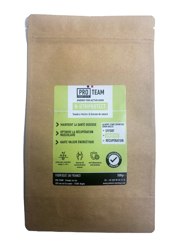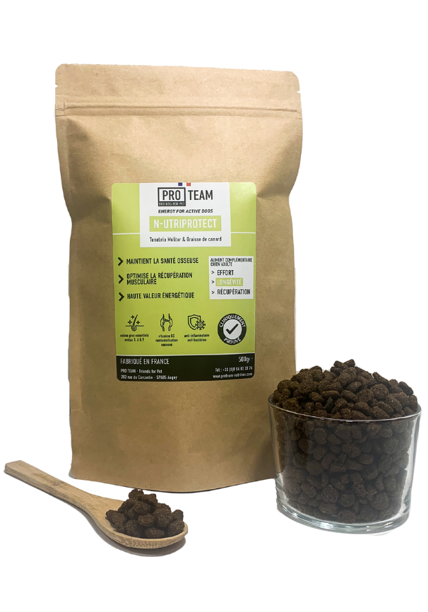 A PRO TEAM N-UTRIPROTECT Longévité egy prémium étrend-kiegészítő, amely Franciaországban készült, Tenebrio Molitor N-ova lisztből és kacsa zsírból áll. Különösen az idősebb kutyák hosszú élettartamának, mozgékonyságának, energiájának és immunfunkciójának támogatására tervezték.