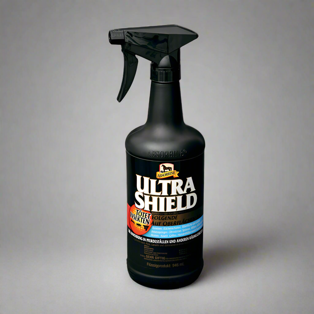UltraShield Black Absorbine® è la formula anti-zanzare e mosche più avanzata sul mercato. La sua tecnologia UltraBond® offre fino a 17 giorni di protezione resistendo a sudore e pioggia. Lo spray elimina e respinge più di 70 specie di insetti (mosche pungenti, tafani, zecche, zanzare, moscerini…) per il comfort assoluto dei vostri cavalli e cani.