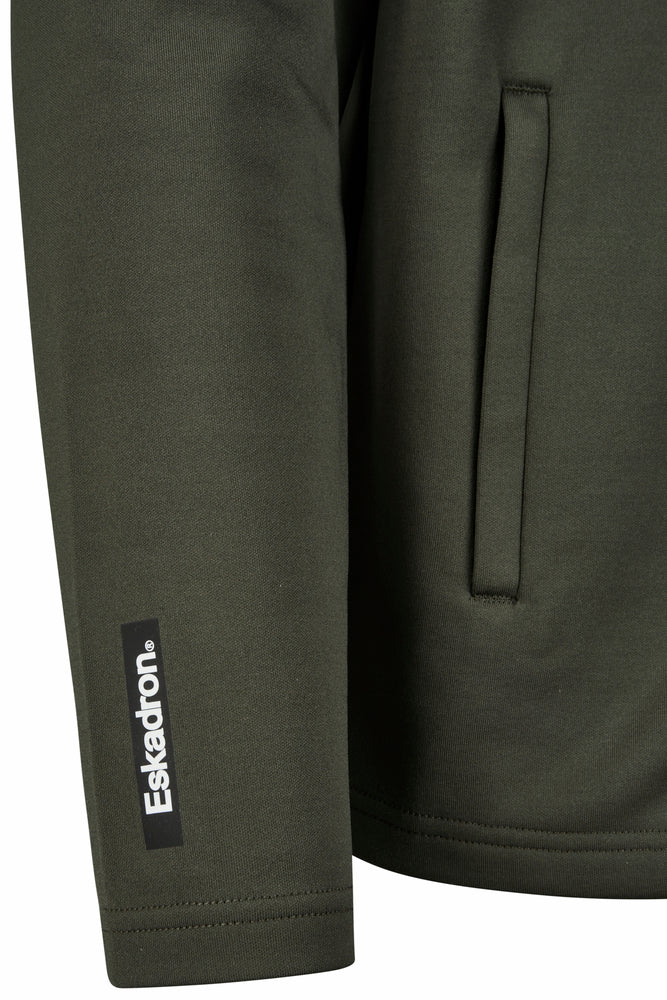 De staande kraag beschermt tegen de kou, terwijl de dubbelzijdige rits met kinbescherming snel aantrekken en verstelbare ventilatie mogelijk maakt. De discrete ritssluitingen aan de zijkanten bieden veilige opbergruimte. De Eskadron-logo's op de borst en mouwen en het badge op de rug geven een mannelijke en verzorgde uitstraling.