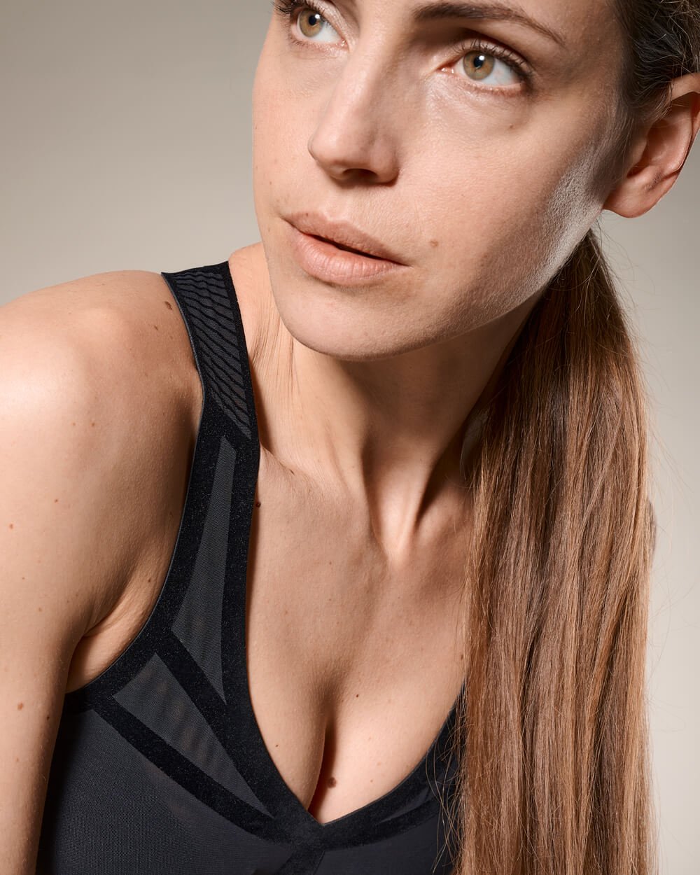 - Nowa oddychająca, mikroperforowana taśma pod biustem: podtrzymuje bez ucisku i zapewnia trwały komfort podczas wysiłku.