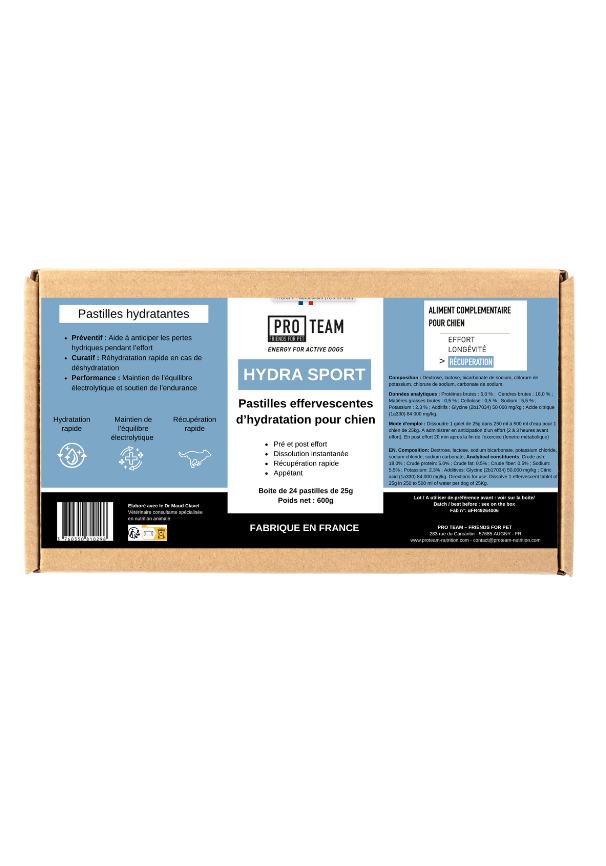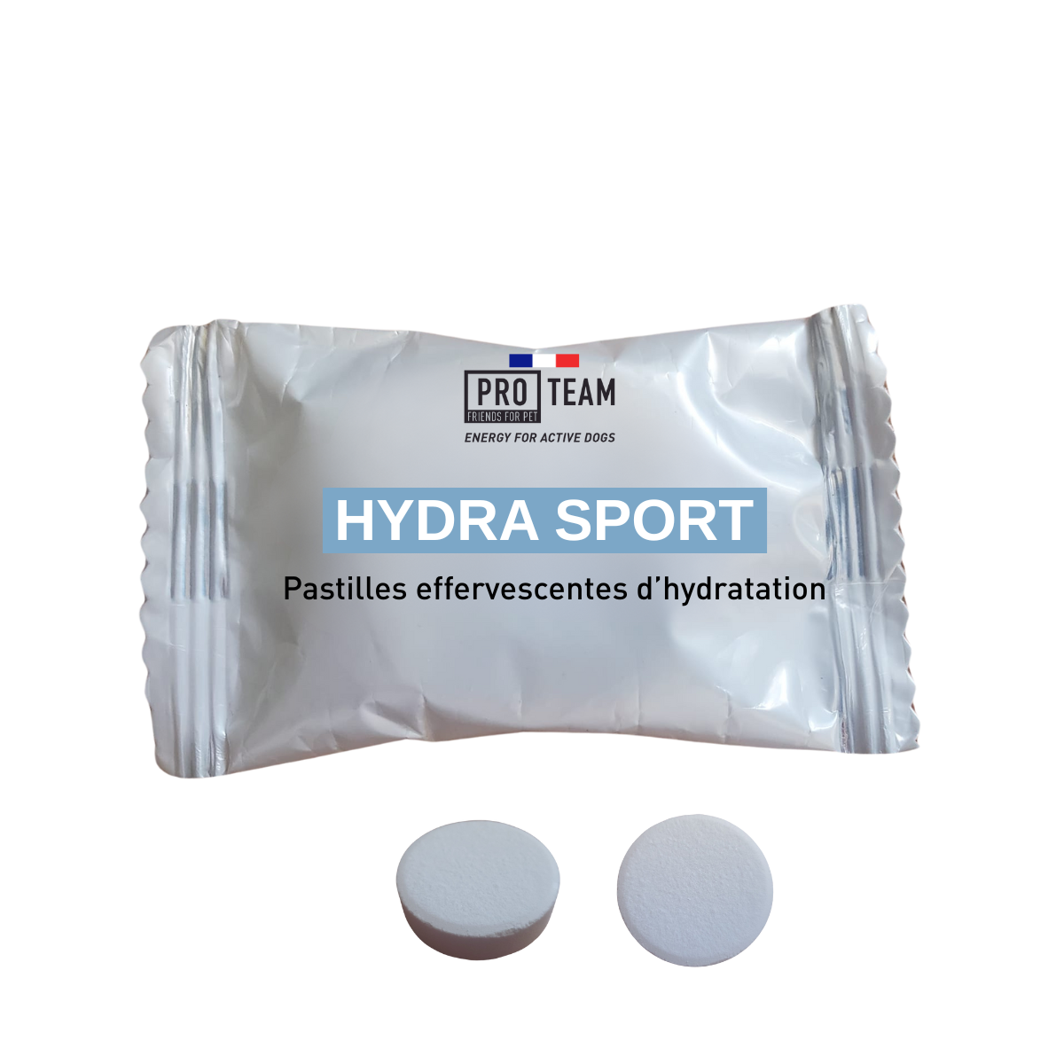 Desenvolvido com a Dra Maud Clavel, veterinária especialista em nutrição animal, Hydra Sport é uma solução de hidratação inovadora para cães desportivos. A sua forma efervescente permite uma dissolução instantânea na água (250 a 500 mL) para uma bebida pronta a usar, antes, durante ou após o esforço.